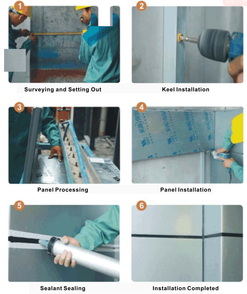 Für Aluminium-artige Joaboa-Platte gibt es zwei Arten Anwendungsmethoden: Stock-u. Nagel-Kombinations-Installations-Methode u. Keel Dry Hanging Installation Method.
